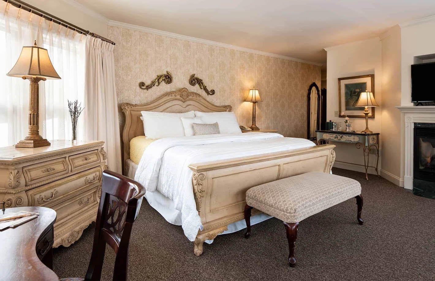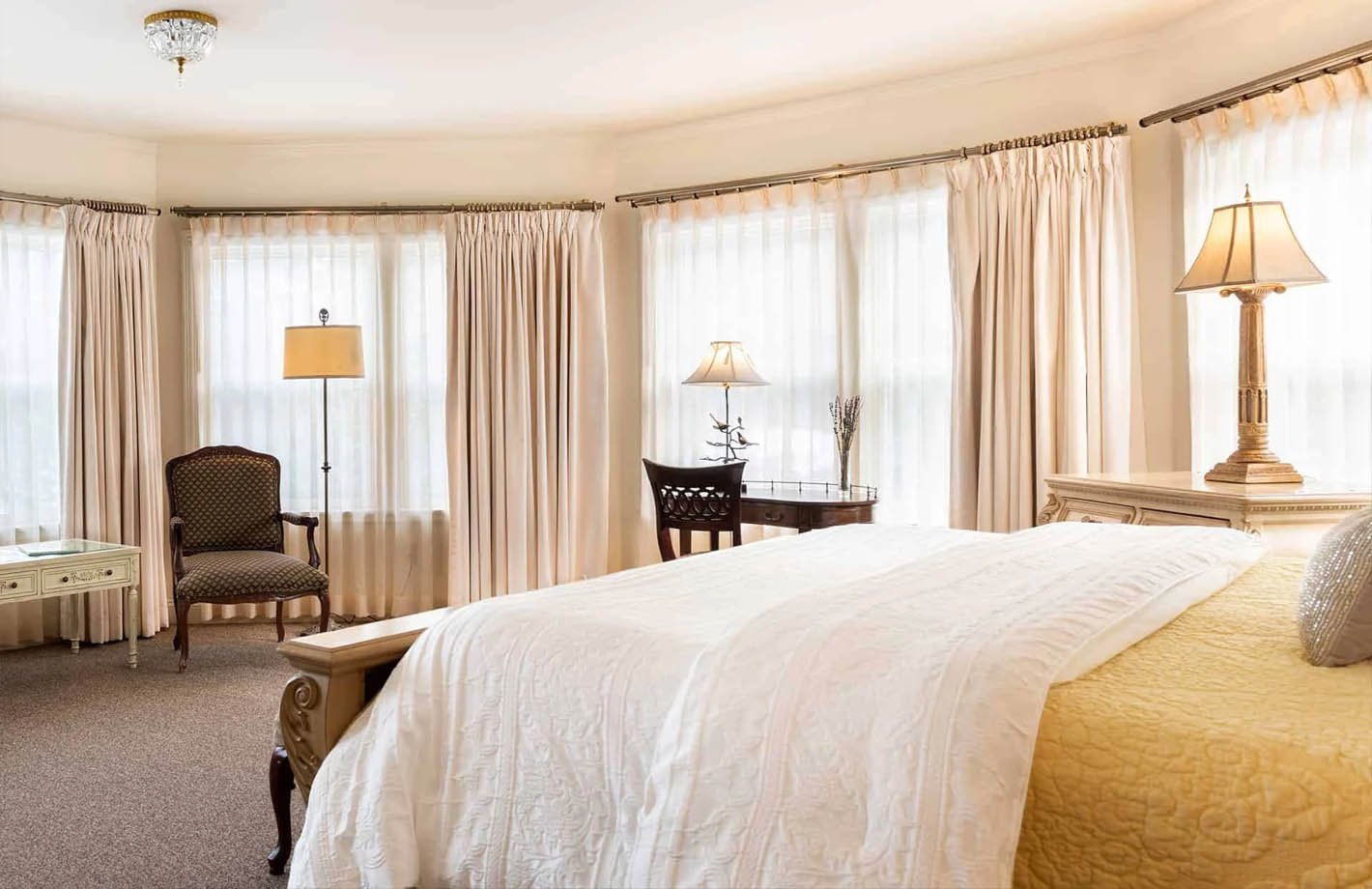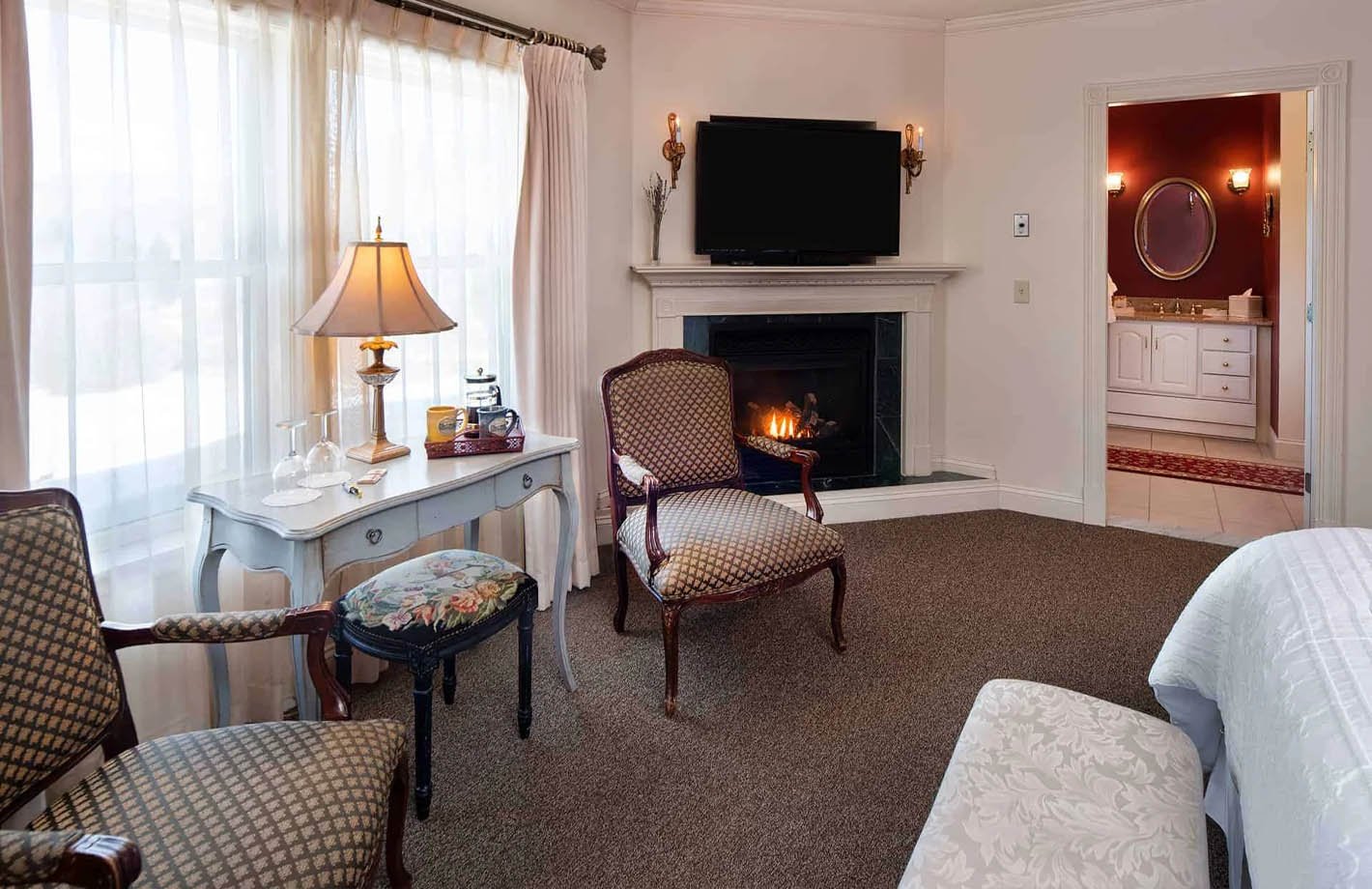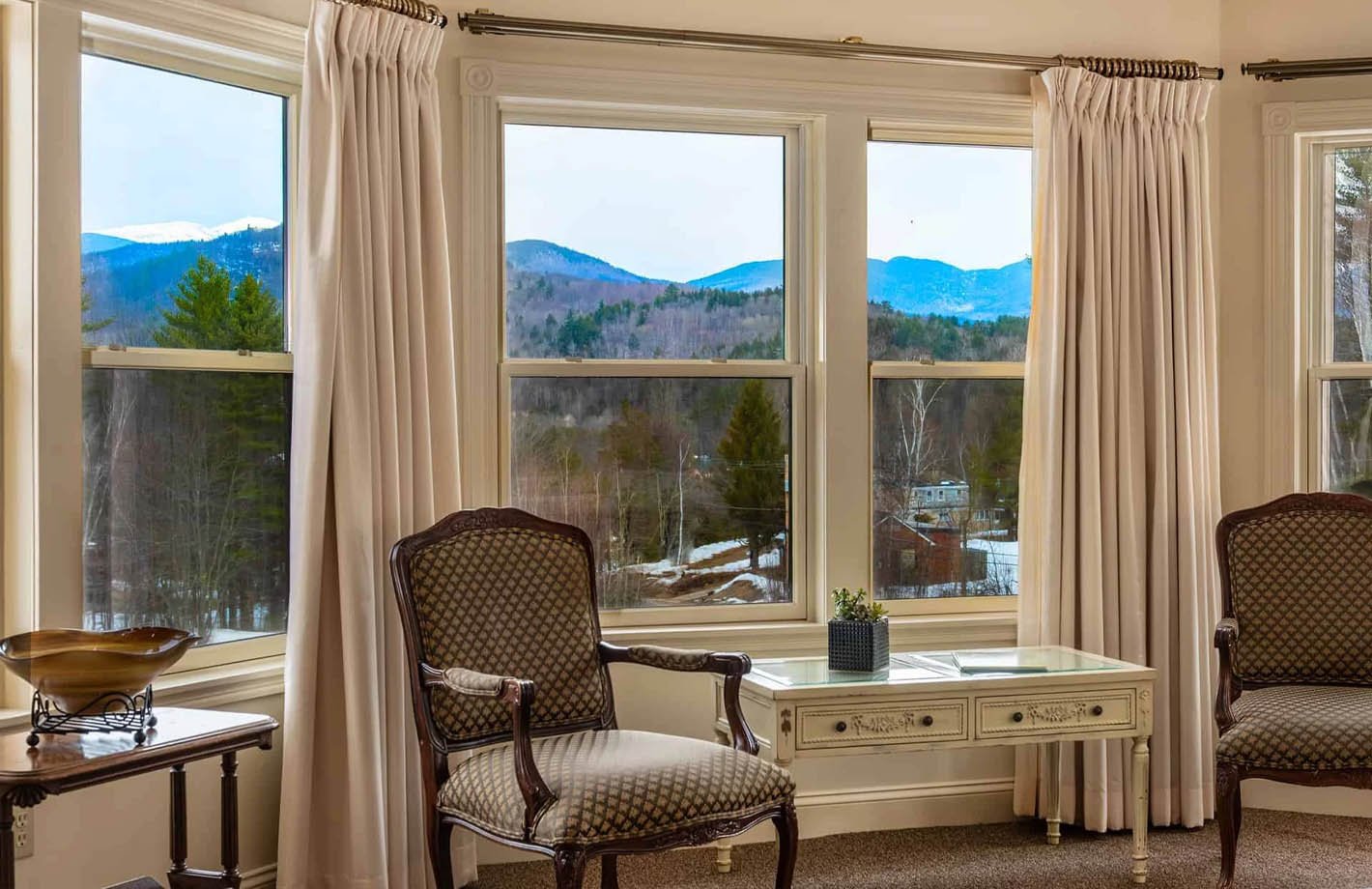 Indulge in the splendor of this suite nestled within the turret of our establishment. From this unique vantage point, immerse yourself in the captivating beauty of the majestic presence of Mt. Washington. The suite’s strategic positioning affords breathtaking views, inviting an abundance of natural light to flood the space through its many windows.